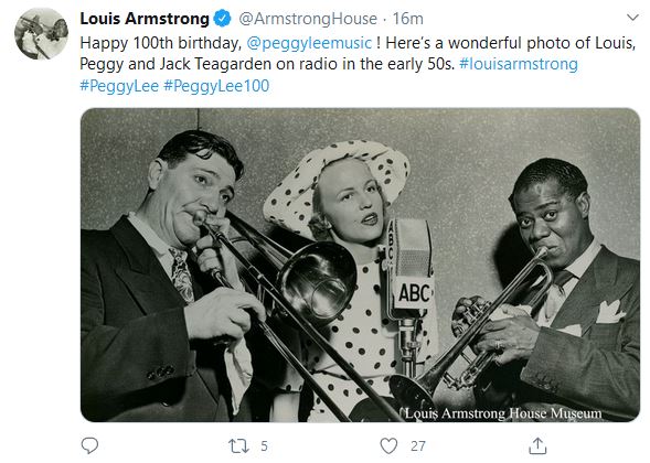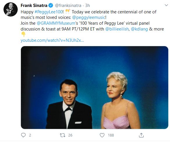 Tributes poured in across social media on May 26, 2020 in celebration of #PeggyLee100 — the hundredth anniversary of Peggy’s birth. Here are just a few of them, along with links to some musical tributes by a variety of performers inspired by Peggy’s singing and songwriting. To see many more tributes to Peggy, follow her on Facebook, Instagram or Twitter.