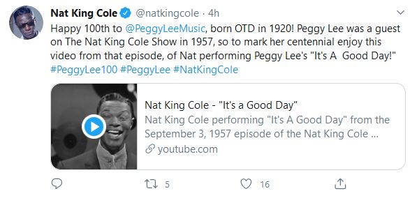 Of course the #PeggyLee100 celebration wouldn’t be complete without some singing by Peggy herself. Siriusly Sinatra is honoring her today with interview clips from her granddaughter Holly Foster Wells and songs from the newly-released album Ultimate Peggy Lee. Stream @SiriusXM free through May 31. https://siriusxm.us/PeggyLee