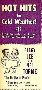 Peggy Lee and Mel Tormé began collaborating as Capitol artists in November of 1949. Their efforts that month included this duet recording of a song they co-wrote, as well as their duet of Haven Gillespie and Beasley Smith’s “The Old Master Painter,” which reached #9 on Billboard’s chart in early 1950. A few days before this session led by pianist Lou Busch and featuring backup vocals by the Mellomen, Lee sang under the pseudonym Susan Melton (a play on the name of Tormé’s then vocal group, the Mel-tones) on the premier recording of Tormé’s ambitious, self-penned concept album California Suite. Lee and Tormé were rare among popular singers in their generation in that they were also songwriters. By the time of this recording, Lee had enjoyed chart success with songs she co-wrote with husband Dave Barbour: “I Don’t Know Enough About You,” “It’s a Good Day,” “Everything’s Movin’ Too Fast” and “Manana.” Tormé, meanwhile, had already collaborated (with Bob Wells) on a beloved Christmas standard, “The Christmas Song” (first recorded and popularized by Nat King Cole) and the ballad “Born to Be Blue,” introduced by Tormé and since recorded by many singers, including Sammy Davis Jr. and Ella Fitzgerald.