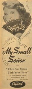 This song and a subsequent one, “When You Speak with Your Eyes,” share a body part (eyes), a recording date (December 2, 1949), a Capitol single release (#801), songwriting credits (Dave Barbour and Peggy Lee, in collaboration with Cuban composer, pianist and bandleader Rene Touzet on “Speak”), and vocal backing by the Guadalajara Boys. In early 1950 a Variety reviewer wrote, “‘My Small Señor’ particularly is a hefty potential…. It’s a really good cut. Reverse sells, too. Miss Lee delivers in her own style and though the tune is not as good, it has a chance.” Although neither song scaled the charts in the way “The Old Master Painter” did around the same time, discographer Ivan Santiago notes that both “Speak” and “Señor” enjoyed some regional success in California, Florida, Massachusetts, Missouri and New York.
