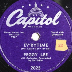 Lee was one of only a few singers, along with Sue Raney and Frances Wayne, to record “Ev’rytime” by Tony Iavello and Mel Leven, which is not to be confused with the similarly titled and more frequently recorded “Ev’ry Time” by Hugh Martin and Ralph Blane. Lee’s version shared a Capitol single with “Goin’ on a Hayride” by, coincidentally, Blane, from his Broadway musical Three Wishes for Jamie. This February 18, 1952 recording session with Sid Feller in New York, where Lee had temporarily moved to pursue television and radio opportunities, proved to be her final one before she moved to Decca Records. Her five-year affiliation with that label yielded her beloved album Black Coffee, her commercial recordings of songs she co-wrote for Walt Disney’s Lady and the Tramp, and several hit singles, including “Lover” and “Mr. Wonderful.”