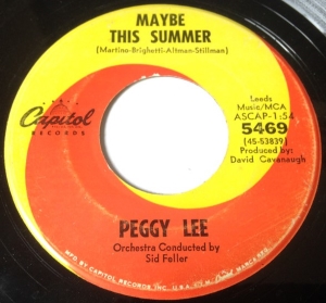 Another English adaptation of an Italian song, “Maybe This Summer,” with lyrics by Arthur Altman and Al Stillman, was adapted from “Odio l’estate” by Bruno Brighetti (lyrics) and Bruno Martino (music). Lee’s recording appeared as the B-side of a Capitol single with “The Shadow of Your Smile (Love Theme from The Sandpiper).” Although the Altman-Stillman lyric has not been recorded beyond Lee’s version, more recent English lyrics by singer Susannah McCorkle (for her own recording) and Joel E. Siegel (introduced by singer-pianist Shirley Horn) have made the song better known, especially to jazz audiences.