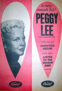 After five years with Decca, Lee returned to Capitol in April of 1957 under auspicious circumstances to make the all-ballad album The Man I Love, arranged by Nelson Riddle and conducted by Frank Sinatra. That same month she recorded three non-album songs: “Baby, Baby, Wait for Me” and “Every Night,” which shared a singles release, and “Uninvited Dream,” written by Sammy Gallop and Burt Bacharach, the latter still in his ‘20s. The version of “Uninvited Dream” heard here, featuring a male choral backing, was not the one that Capitol released in 1957. Four months later, Lee rerecorded the song with a subdued ballad setting, and that version appeared on a Capitol single paired with “Listen to the Rockin’ Bird.” Riddle is credited on the released version but his involvement with this version has not been verified. Lee introduced “Uninvited Dream” and later another Bacharach song, “My Rock and Foundation,” which he wrote with Hal David. She also covered the Bacharach-David hits “Always Something There to Remind Me” and “Raindrops Keep Fallin’ on My Head.”