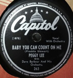 Another “baby” song that never gained popularity, “Baby, You Can Count on Me” was written by film actor and band singer Freddie Stewart. Stewart recorded the song with Charlie Barnet and His Orchestra for Decca. Lee’s version shared a Capitol single release with another “baby” song, “Linger in My Arms a Little Longer, Baby,” which enjoyed modest chart success in September 1946. She sang “Baby, You Can Count on Me” on a few radio programs, including as a duet with Bing Crosby.