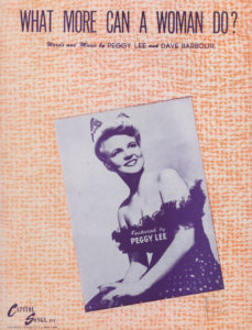 “What More Can a Woman Do?” is the first song written by Peggy Lee that she recorded. It dates from one of her first sessions for Capitol Records, on December 27, 1944. Later in the same session she recorded another of her songs, “You Was Right, Baby.” Both songs, which shared a Capitol single release in 1945, were written with her husband Dave Barbour, who soon became her most enduring and successful songwriting partner through such hits as “It’s a Good Day” and “Mañana.” Lee sang “What More Can a Woman Do?” on radio throughout the late 1940s and filmed it in 1950 for Snader Telescriptions. Sarah Vaughan was one of the first singers to record it, for a 1945 single on the Continental label. Others who recorded it include Mildred Anderson, Donna Brooks, Georgia Carr, Anna Marie Genovese, Ruby Johnson, Audrey Morris, and Big Maybelle, who used it as the title song for her 1962 Brunswick album.