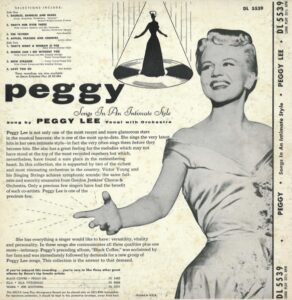 As Iván Santiago writes in his invaluable online Peggy Lee discography, “Songs in an Intimate Style was the successor to the ten-inch vinyl version of Black Coffee. Chosen as Songs in an Intimate Style‘s opening track, the hit ‘Baubles, Bangles and Beads’ was probably the catalyst that led to the creation of this song collection. Decca must have wanted to capitalize on the commercial success of that recent hit single, and also on the critical success of Lee’s previous album. The promotional note in the back cover of the Intimate LP states that ‘Peggy’s preceding album, Black Coffee, was acclaimed by her fans and was immediately followed by demands for a new group of Peggy Lee songs. This collection is the answer to that demand.'”