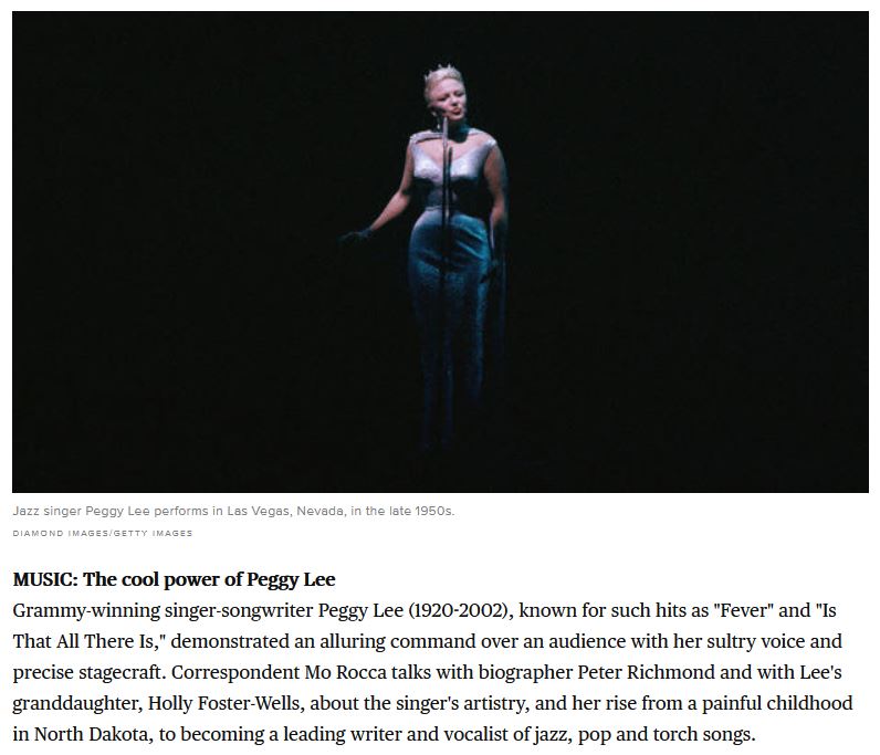 On Sunday, February 6, 2022, CBS Sunday Morning aired a ten-minute segment about Peggy Lee’s “cool power” that featured Peggy’s granddaughter Holly Foster Wells and biographer Peter Richmond. Correspondent Mo Rocca visited the Midland Continental Depot and Peggy Lee Museum in Wimbledon, North Dakota, where he and Holly sat down to discuss the legendary singer-songwriter in the railroad depot where Peggy lived as a child.