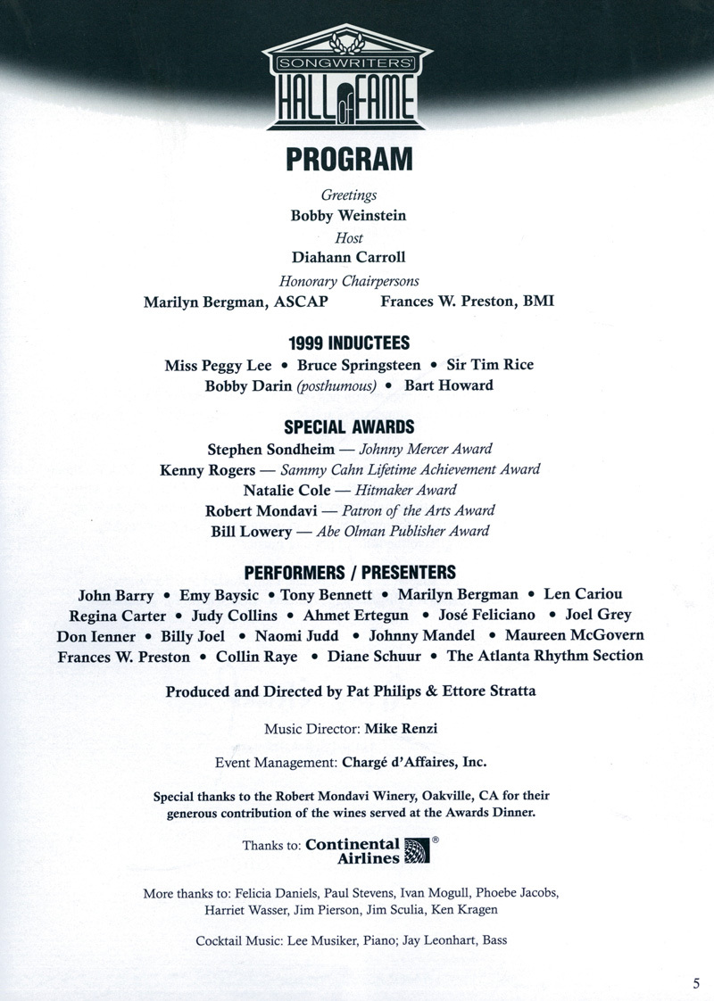 On June 9, 1999, Peggy Lee was inducted into the Songwriters Hall of Fame along with Bruce Springsteen, Bart Howard (most famous for “(In Other Words) Fly Me to the Moon,” a song Peggy was among the first singers to record), Tim Rice (lyricist for “I Don’t Know How to Love Him,” which Peggy recorded) and, in a posthumous honor, Bobby Darin, with whom Peggy performed on television.