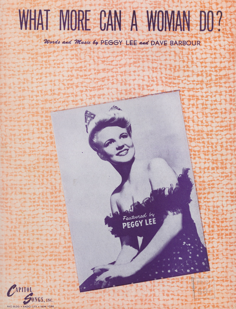 "What More Can a Woman Do?" is the first song co-written by Peggy that she recorded, from a Capitol Records session on December 27, 1944. Later in that same session she recorded another of her songs, “You Was Right, Baby.” Both songs were written with her new husband, Dave Barbour, who quickly became her most enduring and successful songwriting partner. Peggy sang “What More...” on radio throughout the late 1940s and she filmed it in 1950 for Snader Teleions (see “Listen” link above).