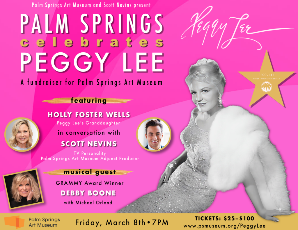 “Palm Springs Art Museum is the perfect spot and benefactor for this event. We discovered that in 1987 Peggy Lee herself appeared on stage at the Annenberg Theater in a benefit for what was then known as the Palm Springs Desert Museum. So, in some ways this feels like an incredible full circle moment of Peggy Lee returning to Palm Springs to help fundraise for the Art Museum once again,” added Scott Nevins.