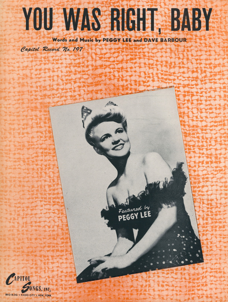 This is the second Lee-Barbour composition Peggy recorded, from the same session as the first, “What More Can a Woman Do?”, on December 27, 1944. She sang “You Was Right, Baby” on radio throughout the late 1940s and she filmed it in 1950 for Snader Teleions (see “Listen” link above).
